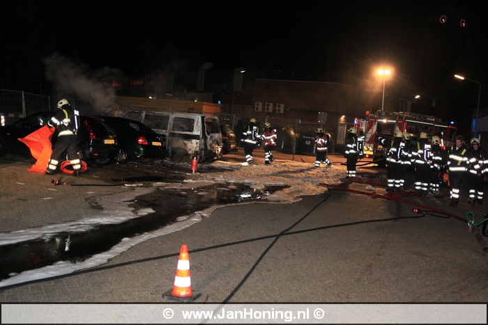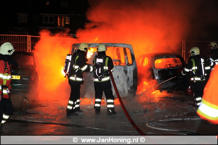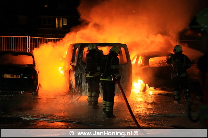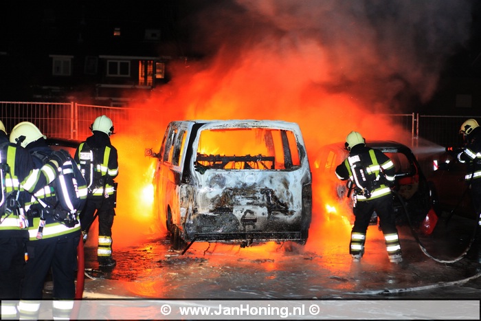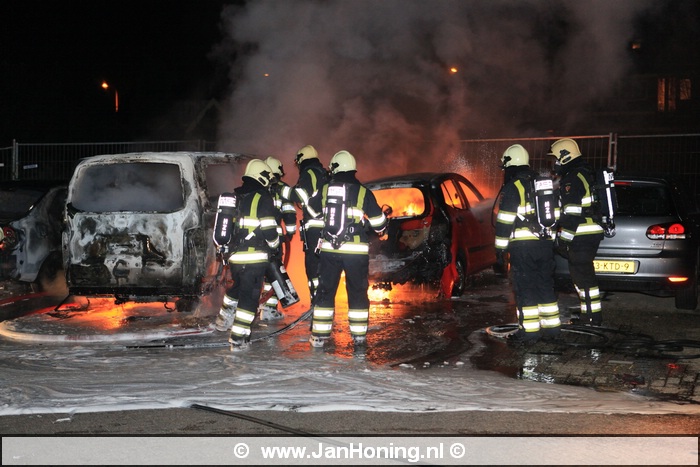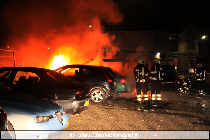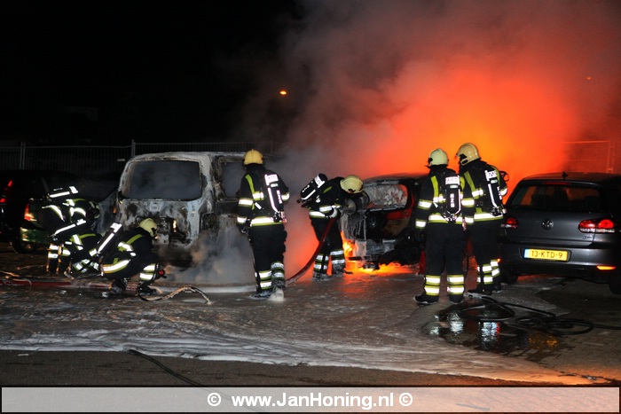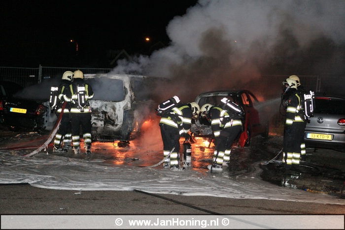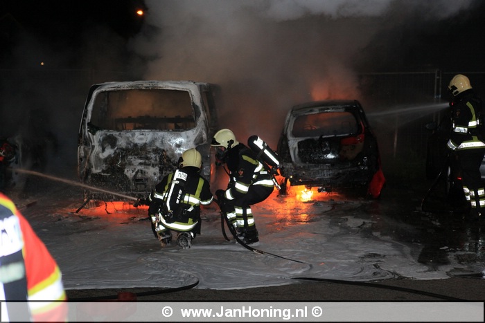 Twee voertuigen brandde totaal uit en nog eens twee auto's raakte beschadigd door de brand.