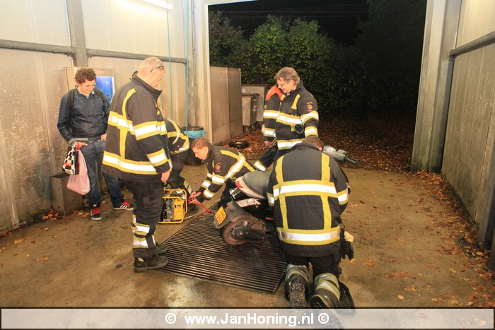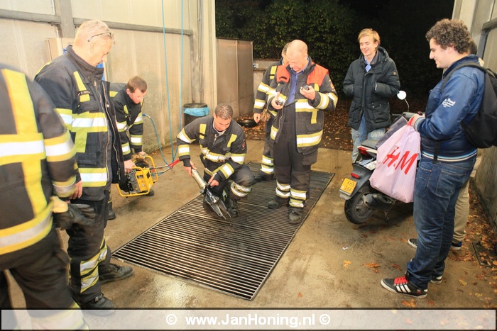 Een scooter was in het washok van een benzinestation met zijn standaard vast komen te zitten in het afvoerrooster. Met behulp van de brandweer kon de scooter bevrijdt worden.