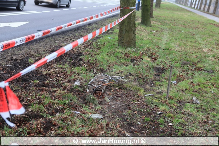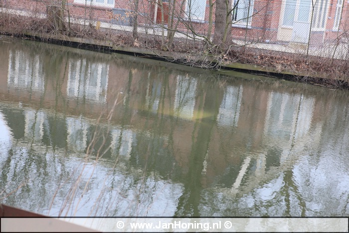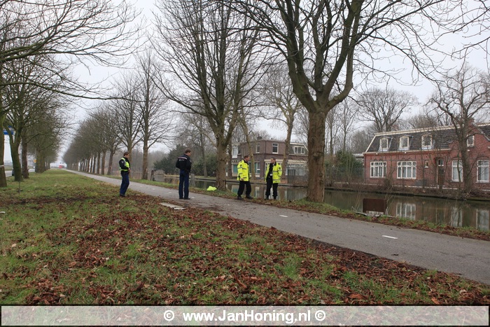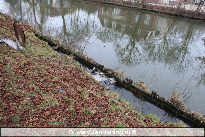 opgevangen door omstanders. Het voertuig is ligt onder water in het midden van het kanaal.