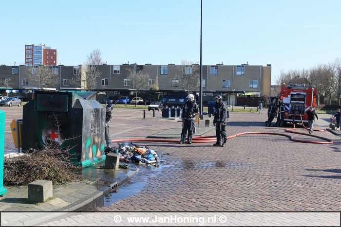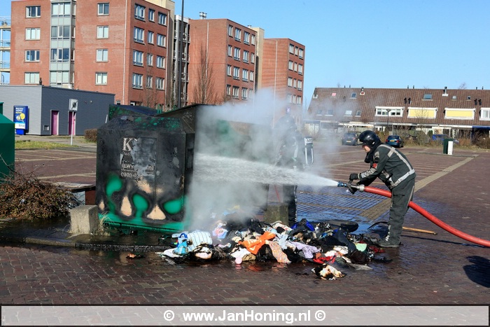 Op de parkeerplaats van de AH stond een kledingcontainer in de brand. De brandweer heeft alle kleding uit de container gehaald met een hooivork en alles goed nat gespoten. De container en kleding kan als verloren worden beschouwd.