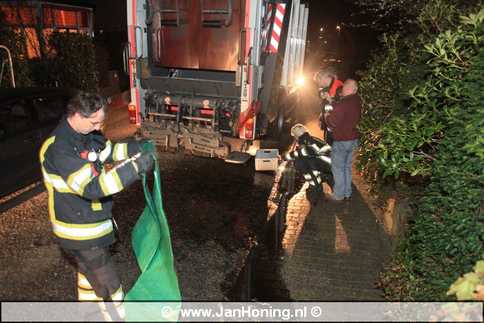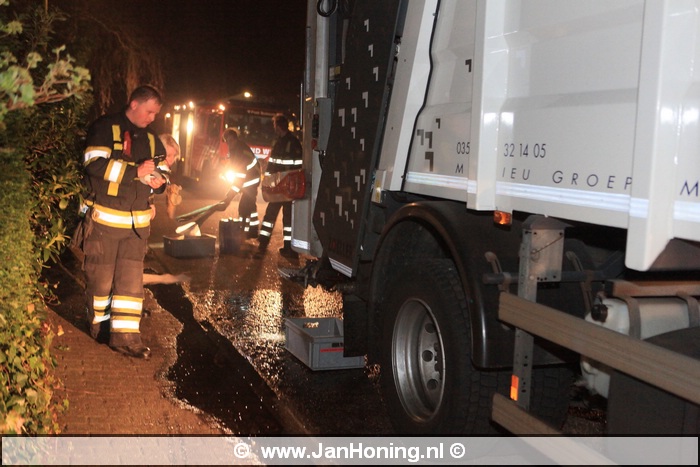 Een olie leiding van een vuilniswagen was gesprongen bij het openen van de achterklep. Dit gebeurde op de J. F. Ervertslaan in Bussum.