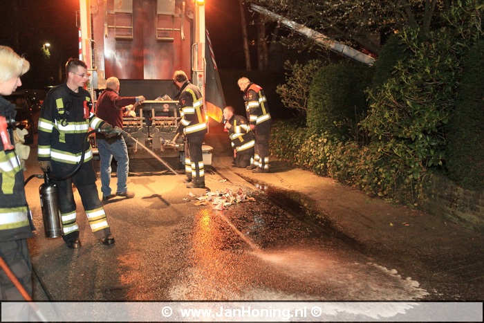 De chauffeur zette meteen de druk van de leiding af maar kon niet voorkomen dat er ongeveer 30 liter olie op het wegdek terecht kwam. De brandweer kwam ter plaatse om de olie onschadelijk te maken. De vuilniswagen kon zijn weg vervolgen maar kon geen oud papier meer laden.